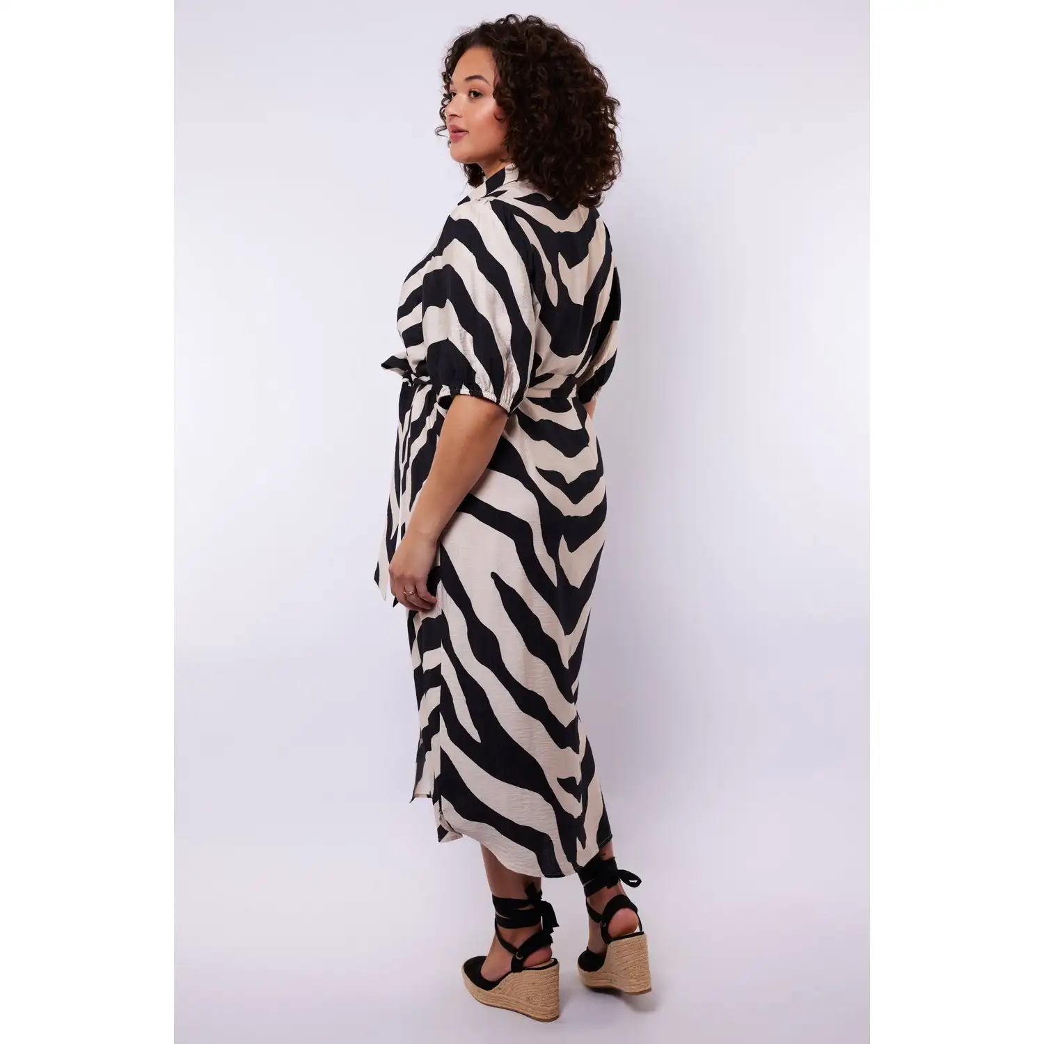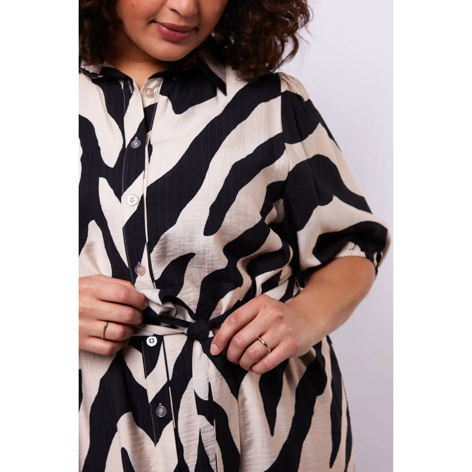 [sk_markdown]Een stijlvolle blikvanger met een elegante en vrouwelijke uitstraling. De Anniston jurk heeft een losvallende pasvorm met een klassieke kraag en doorknoopsluiting, terwijl de halflange mouwen en bijpassende strikceintuur zorgen voor een comfortabel en flatterend silhouet. De zachte zebra print en soepelvallende kwaliteit geven de jurk een speelse, maar verfijnde touch.