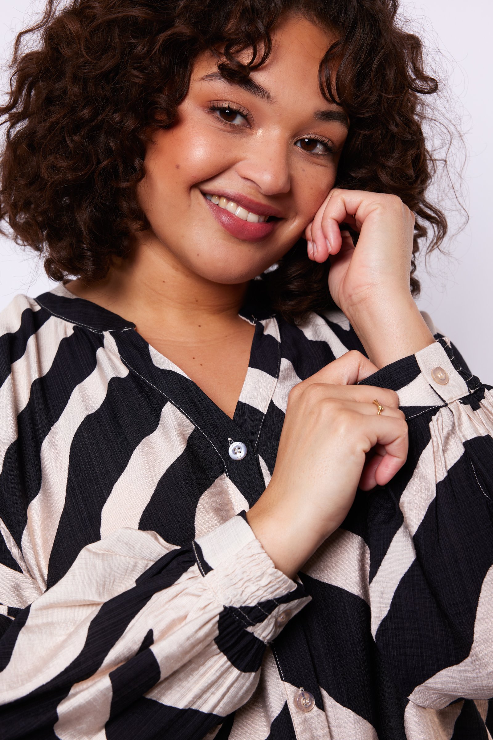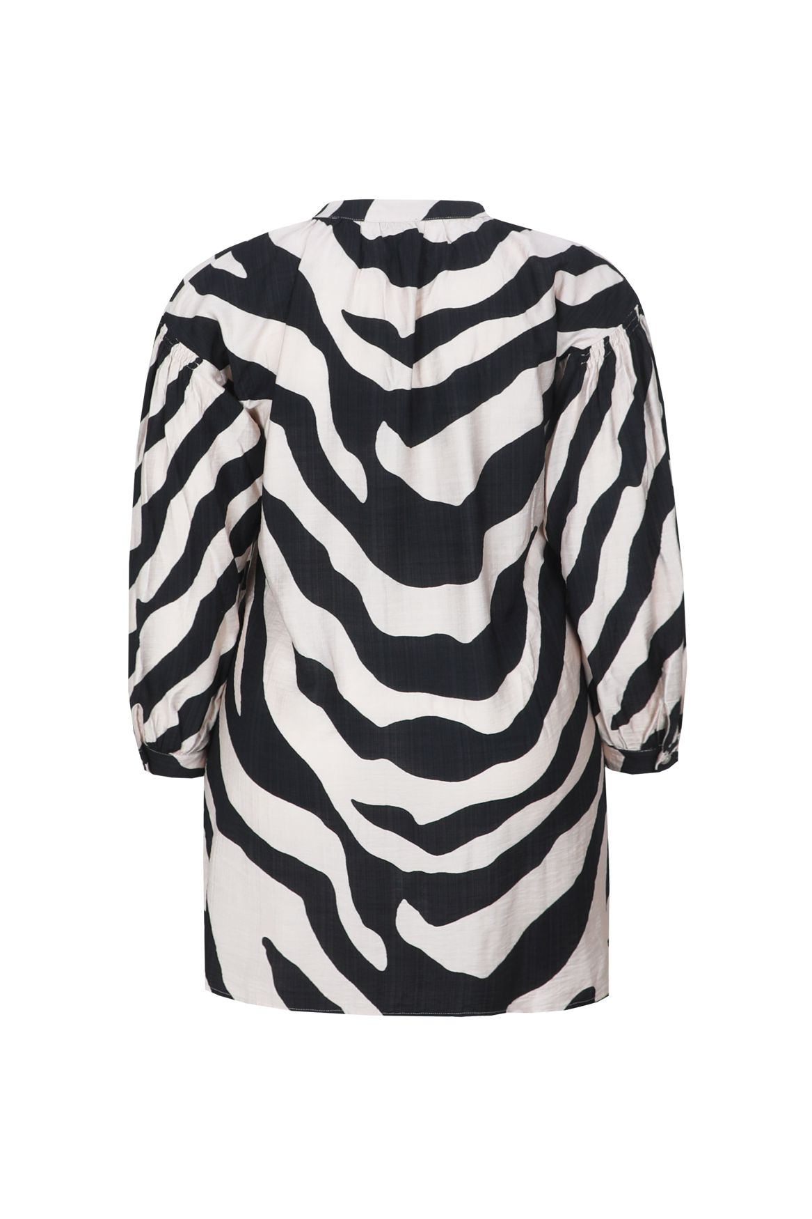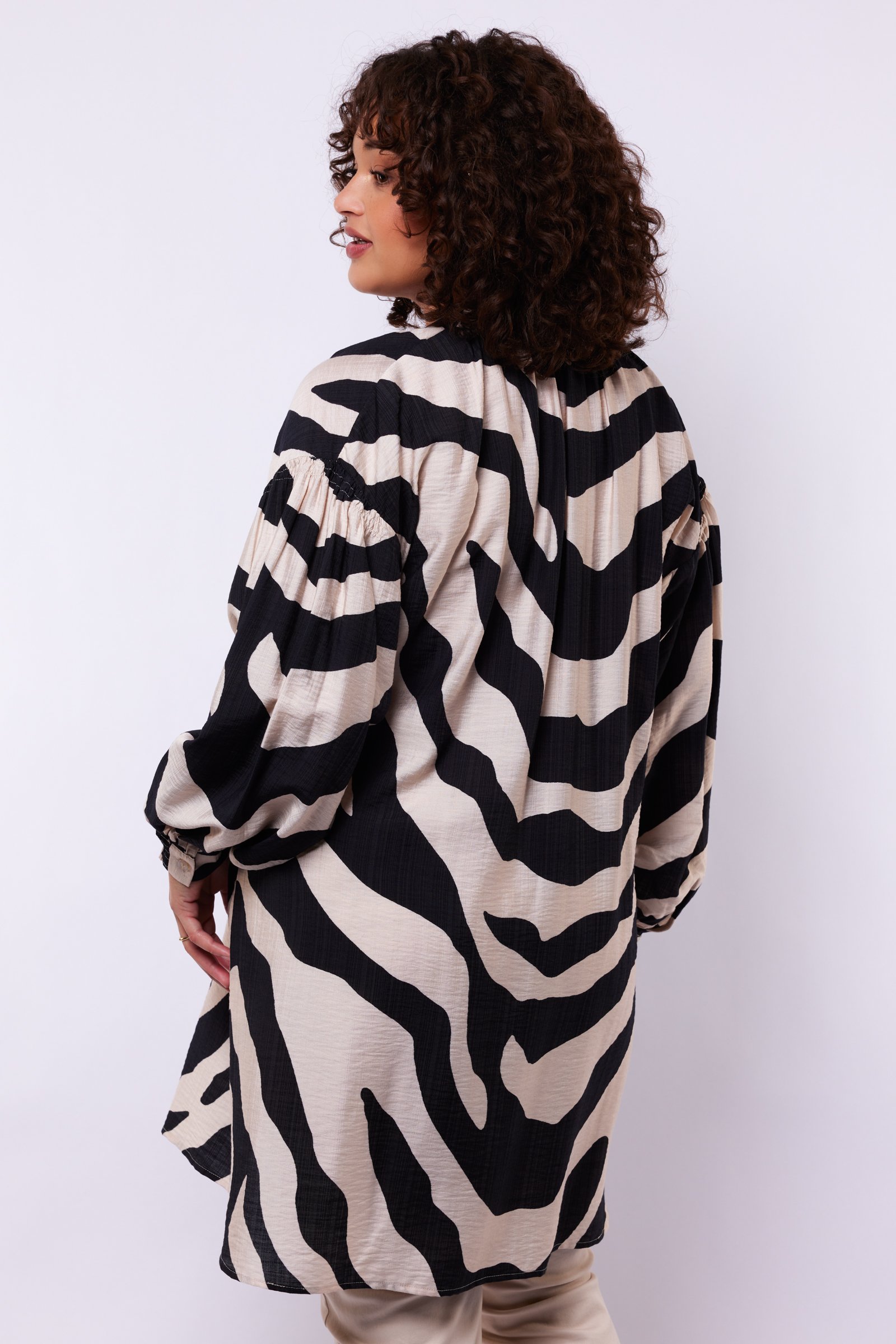 Een echte eyecatcher met een krachtige en vrouwelijke uitstraling. De Auri tuniek heeft een losvallende pasvorm met een ronde hals en knoopsluiting, terwijl de lange mouwen met elastische boorden zorgen voor extra comfort. De opvallende zebra print, subtiele plooidetails bij de schouders en de soepelvallende kwaliteit geven het item een speelse en stijlvolle touch.