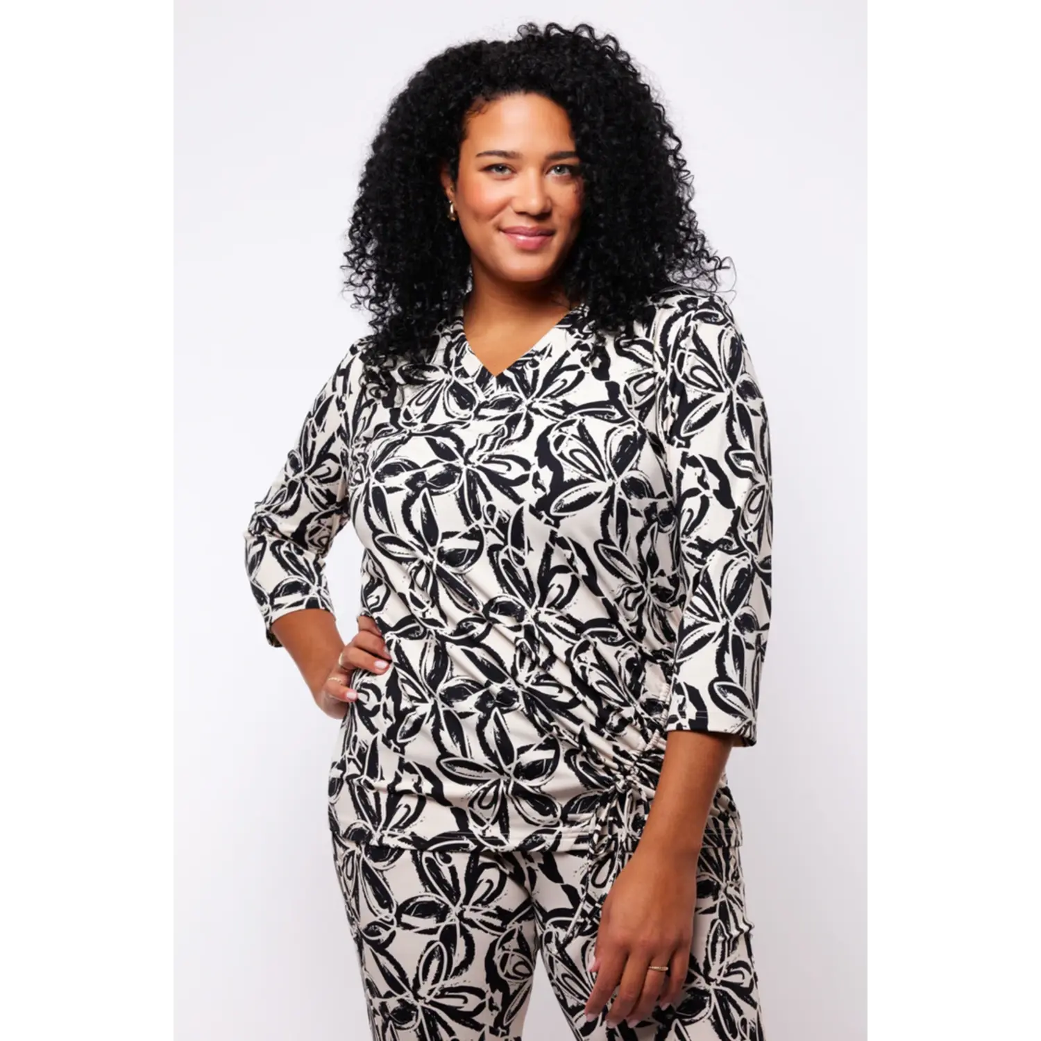 [sk_markdown]De Callie top heeft dezelfde opvallende print als de Caitlyn broek, waardoor deze perfect samen te combineren is. De top is ontworpen met driekwart mouwen, een vrouwelijke V-hals en een speels strikdetail aan de onderkant. Een veelzijdig en stijlvol item voor een verfijnde look!