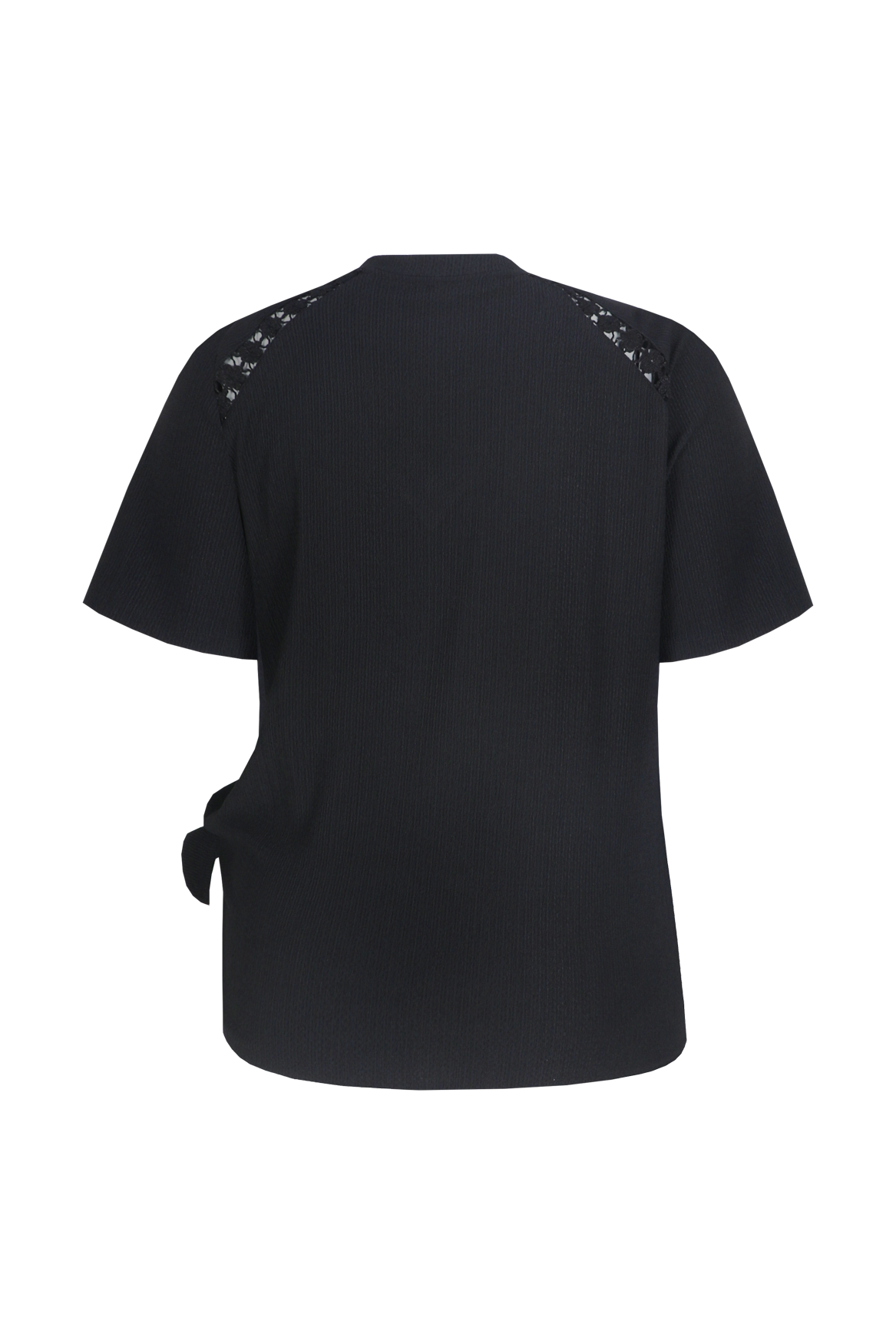 Een moderne essential met een zachte en vrouwelijke uitstraling. De Jaya top heeft een losvallende pasvorm met een flatterende V-hals en korte mouwen, uitgevoerd in een comfortabele, licht gestructureerde kwaliteit die soepel valt. De verfijnde kanten inzet op de schouders en het strikdetail aan de zijkant geven het ontwerp een speelse en elegante touch.