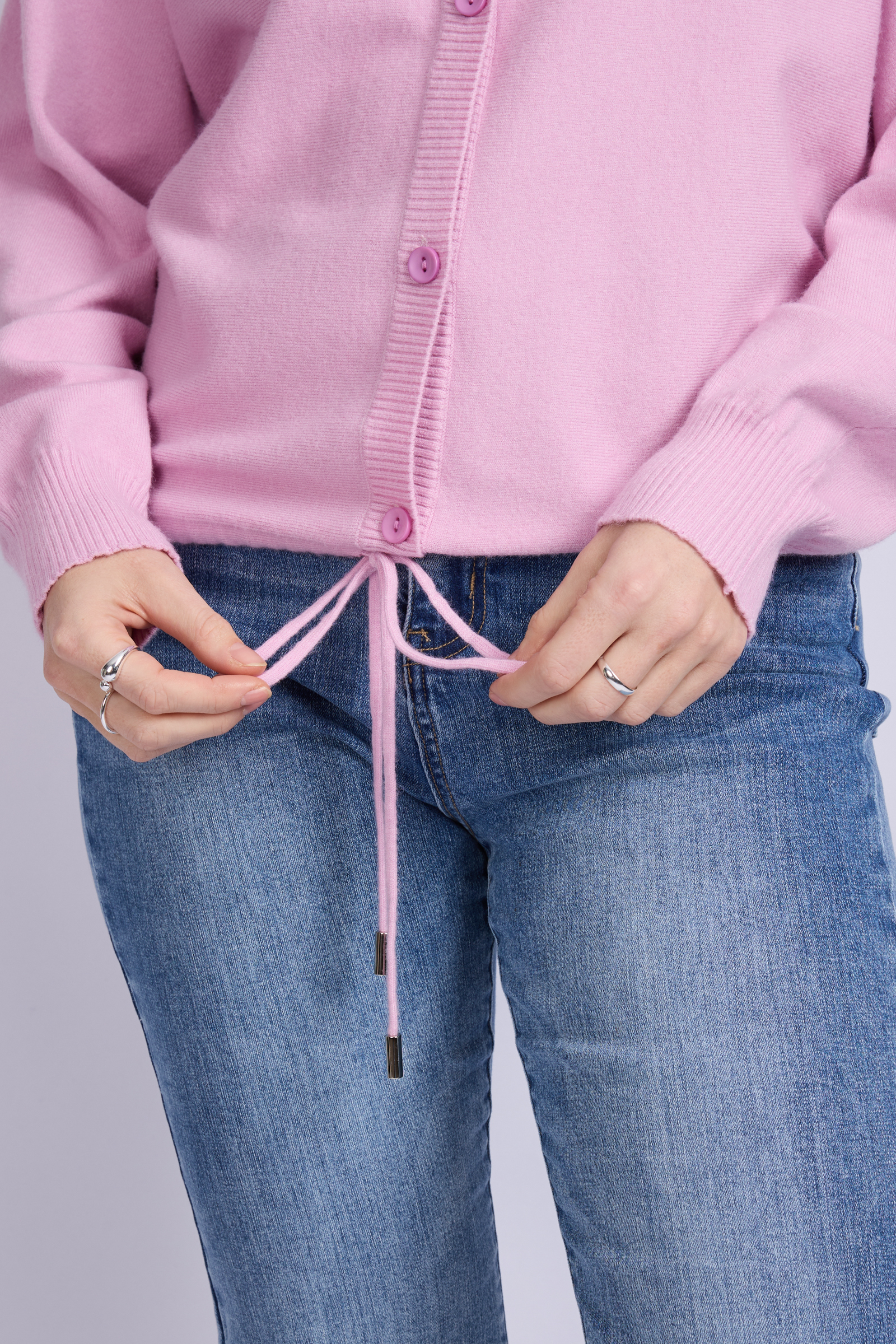 De Kaira trui is een moderne basic met een vrouwelijke touch. Het ontwerp heeft een diepe V-hals en knoopsluiting aan de voorzijde, afgewerkt met een strikkoord in de zoom voor een subtiele, aanpasbare pasvorm. De zachte knit en rechte mouwen zorgen voor een comfortabele, elegante look. Een veelzijdig item dat zowel open als gesloten gedragen kan worden, ideaal voor een casual chic outfit.