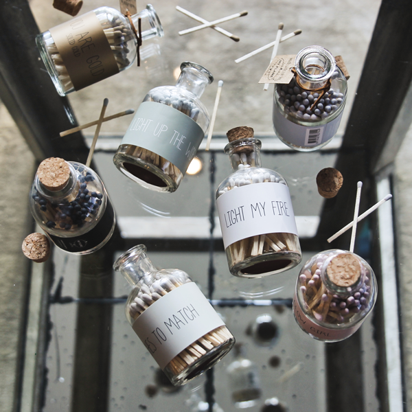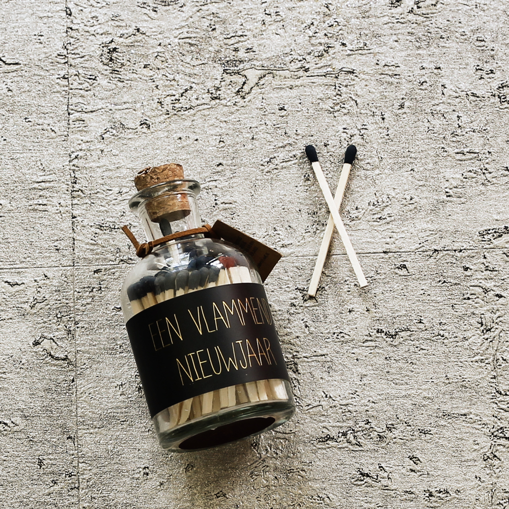 Een glazen potje met 80 zwarte lucifers. Met deze lucifers ben je helemaal in stijl met een matchende kaars. Het potje wordt gesierd met de tekst ‘Een Vlammend Nieuwjaar’.