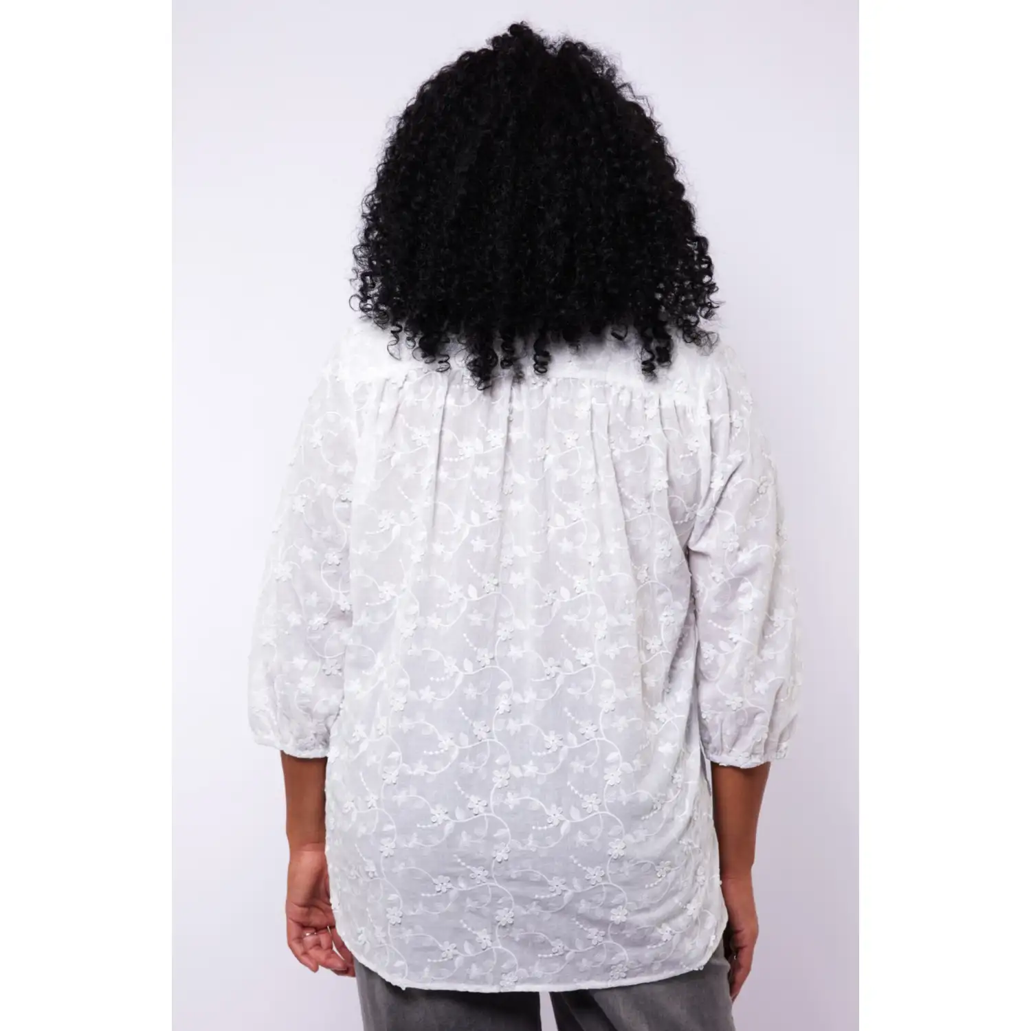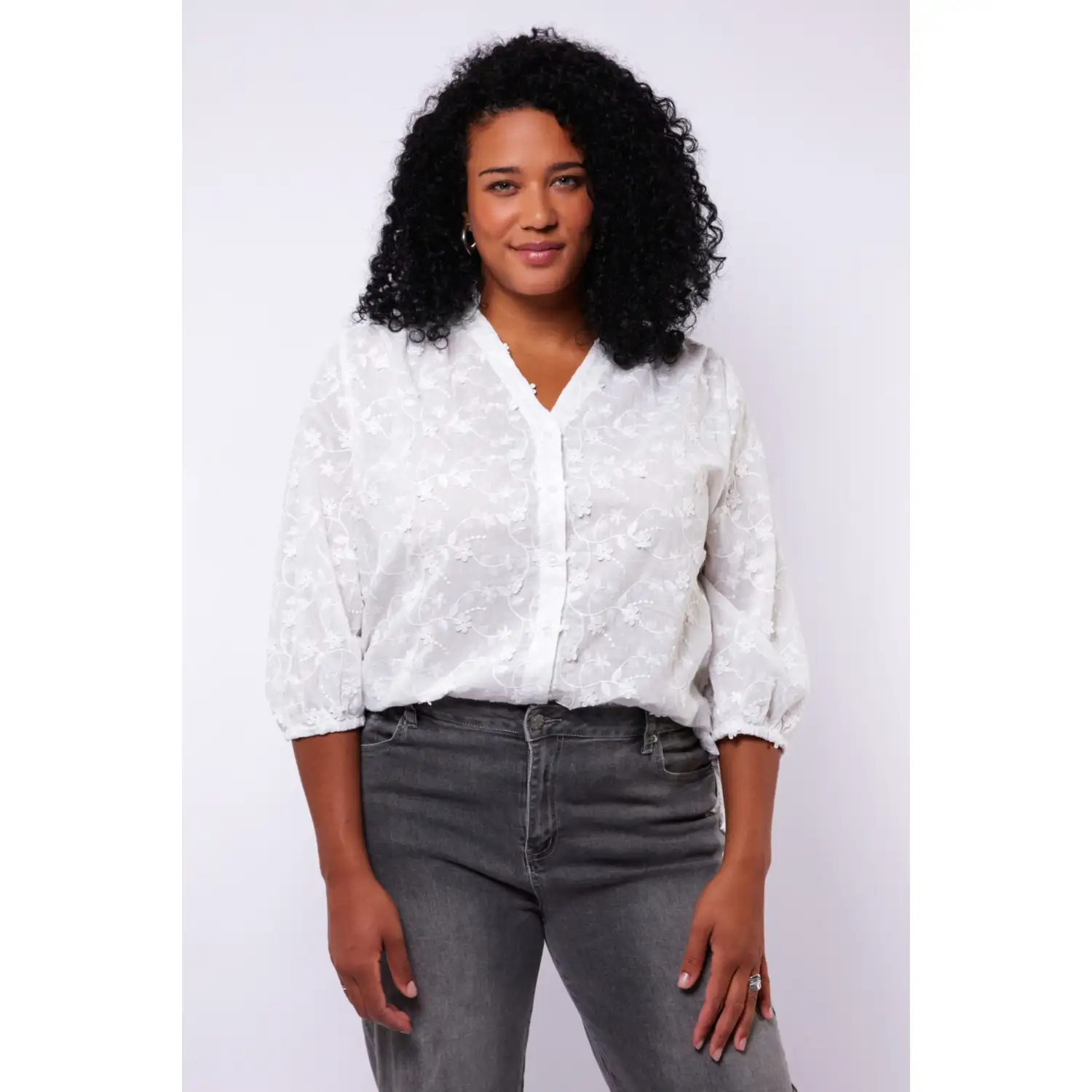 [sk_markdown]Fris, vrouwelijk en tijdloos. De Tessa blouse is gemaakt van een luchtige stof met een fijn bloemmotief in borduureffect. De rucherand langs de hals en de 3/4-mouwen met elastische zoom geven de blouse een romantische uitstraling, perfect voor een elegante voorjaarslook.
