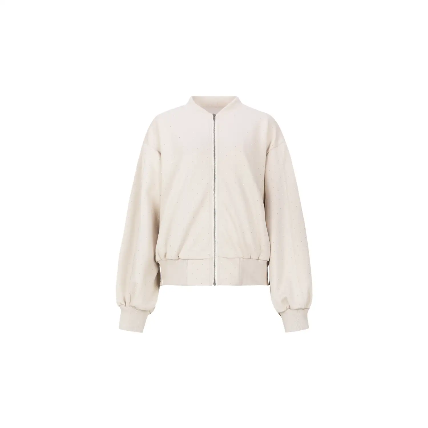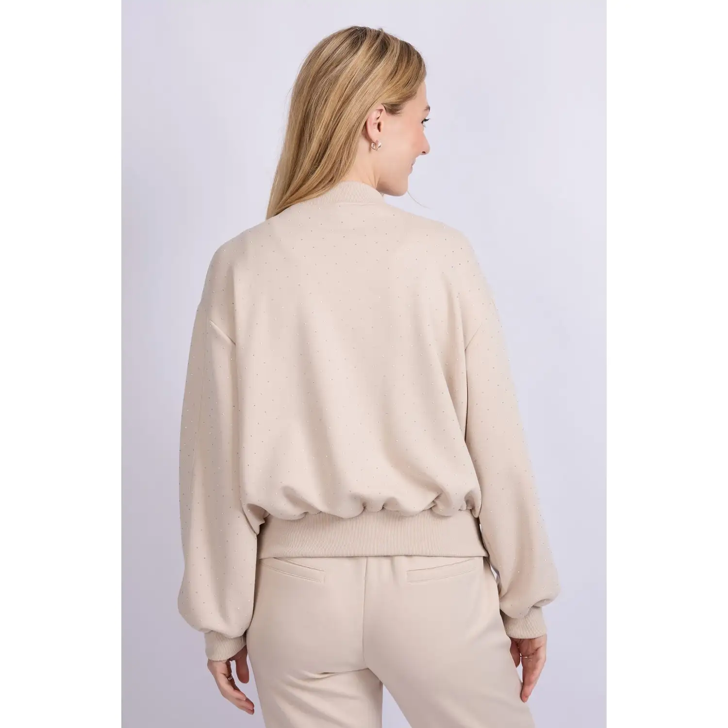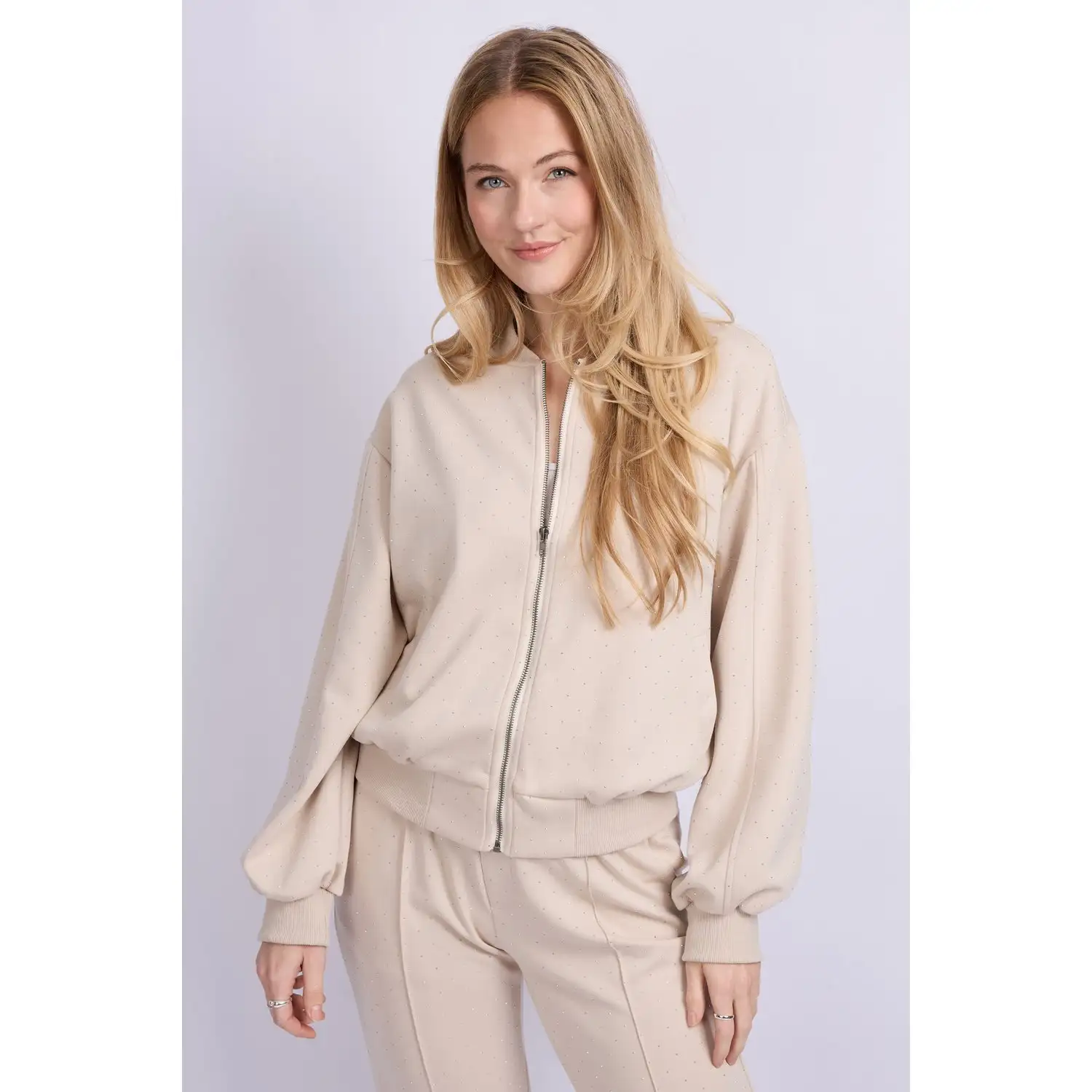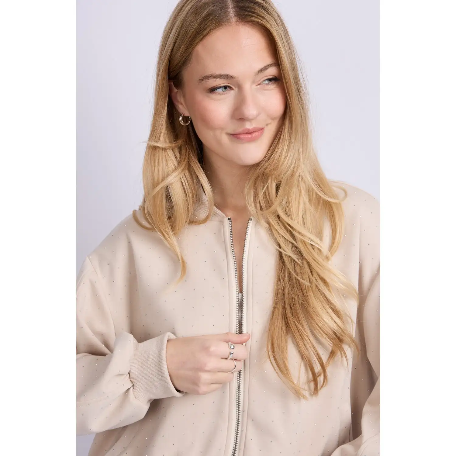 [sk_markdown]De Wanda jacket is een eigentijdse bomber met een verfijnde twist. Het ontwerp heeft een ontspannen pasvorm met elastische boorden en een subtiele glans in de stof, afgewerkt met kleine ingeweven subtiele stipdetails(steentjes). De ritssluiting en ronde hals geven het jasje een moderne uitstraling. Perfect te combineren met een jeans of pantalon voor een casual chic look met een vleugje sportieve elegantie.