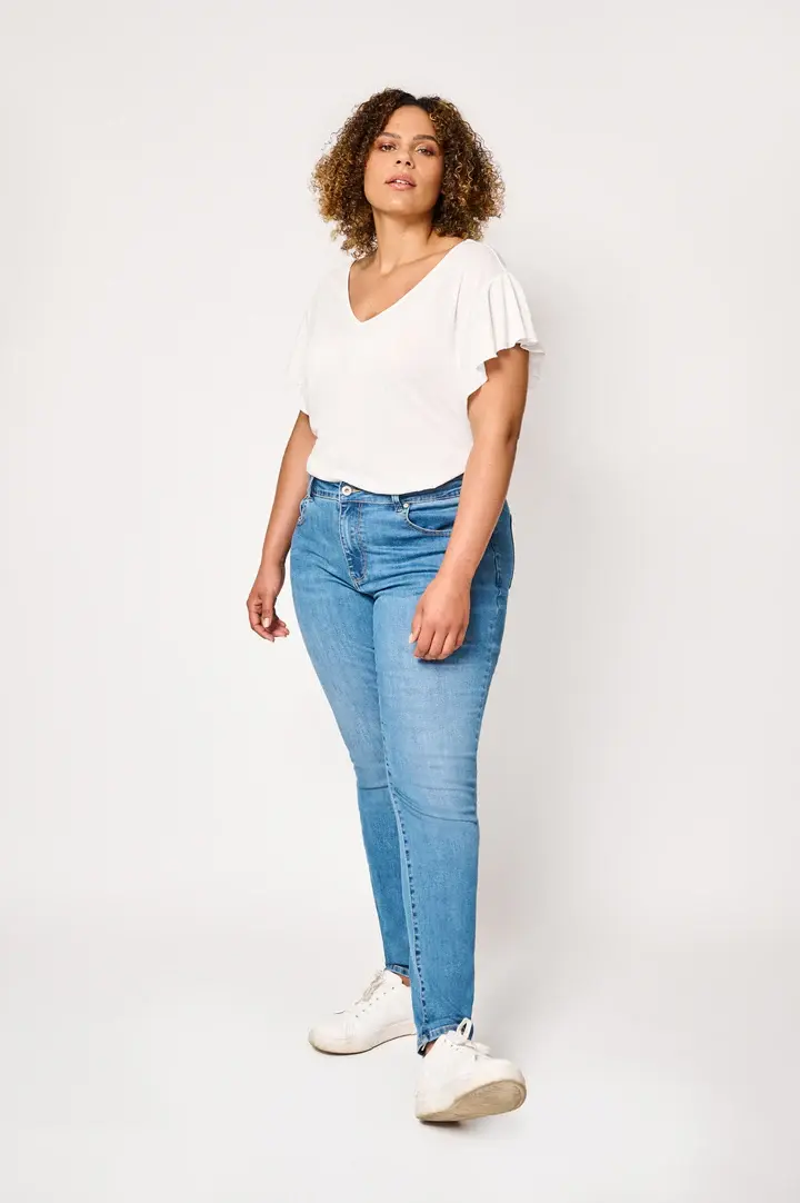 Skinny fit – 5-pocket model – Mid rise – Stretch Een tijdloze musthave. De Zola skinny jeans in klassiek blauwe jeanskleur is geschikt voor ieder model in ieder seizoen. Door de toevoeging van stretch en zacht rayon heeft de jeans een comfortabele fit. De nauwsluitende pasvorm is een ware figure hugger en zorgt voor een mooi silhouette. De 5-pocket elementen maken deze klassieke jeans af. De binnen beenlengte van de Zola Skinny fit is 80 cm. Model is 1.79 en draagt een maat 46